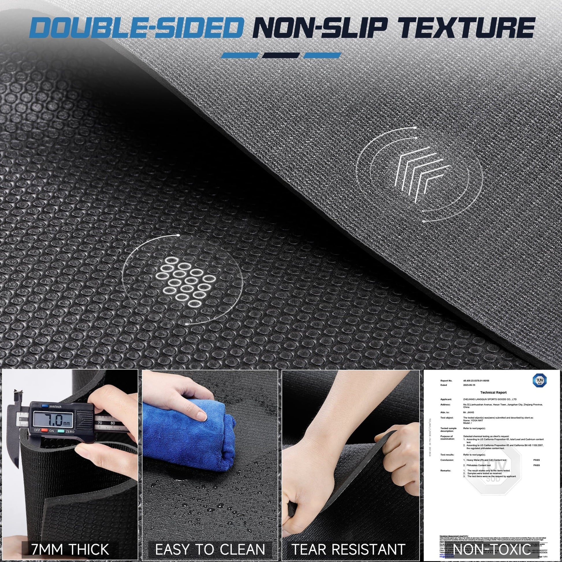 - 【Shock Absorbing Comfort】This 7mm thick fitness mat uses high-density micro-foam technology, providing excellent cushioning for your palms, knees, wrists and ankles. After many tests, the fitness mat can effectively protect joints during exercise and provide additional support and comfort, greatly reducing the risk of injury. Whether you're exercising on wood floors, carpet, concrete or tile, this gym mat protects your joints and reduces noise.