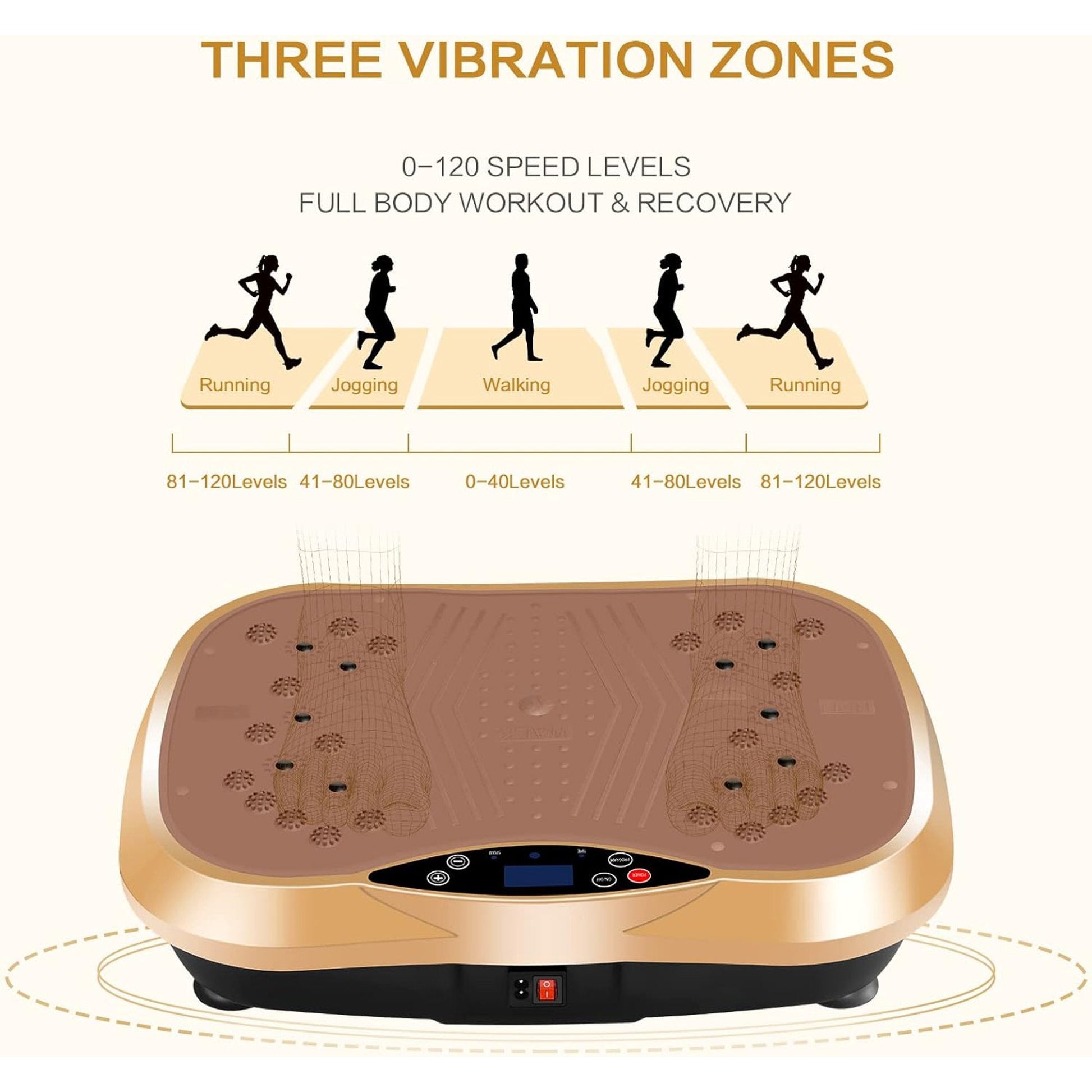 - VERSATILE & CONVENIENT REMOTE CONTROL With 1 to 120 adjustable speed settings, customize your workout with ease! Our user-friendly remote control allows you to switch speeds at the touch of a button. The professional-grade vibration plate comes with two resistance bands, enabling you to enhance your fitness routine. Combine vibration exercises with sit-ups, push-ups, yoga, and more¡ªjust 10 minutes a day for effective sports training, weight loss, and fat burning!