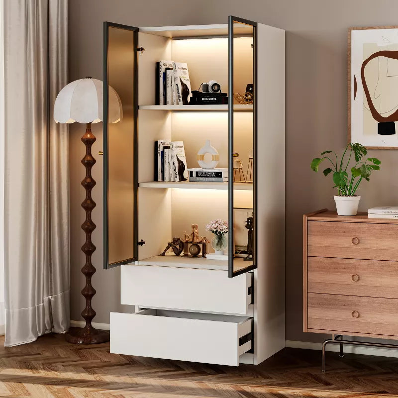 The glass display cabinet consists of 2 glass doors, 3 shelf racks, and 2 drawers. Whether you need to store household items or display your beloved decorations, books, etc., this cabinet can accommodate and seamlessly integrate into any room such as the kitchen, living room, study, etc.