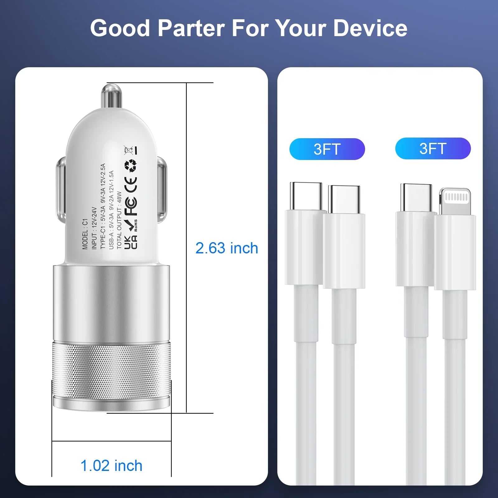 - [What You Get] 1 x 48W Car Charger Adapter, 1 x 3FT USB C to USB C Cable, 1 x 3FT USB C to Lightning Cable. 12-month warranty, and our friendly customer service.