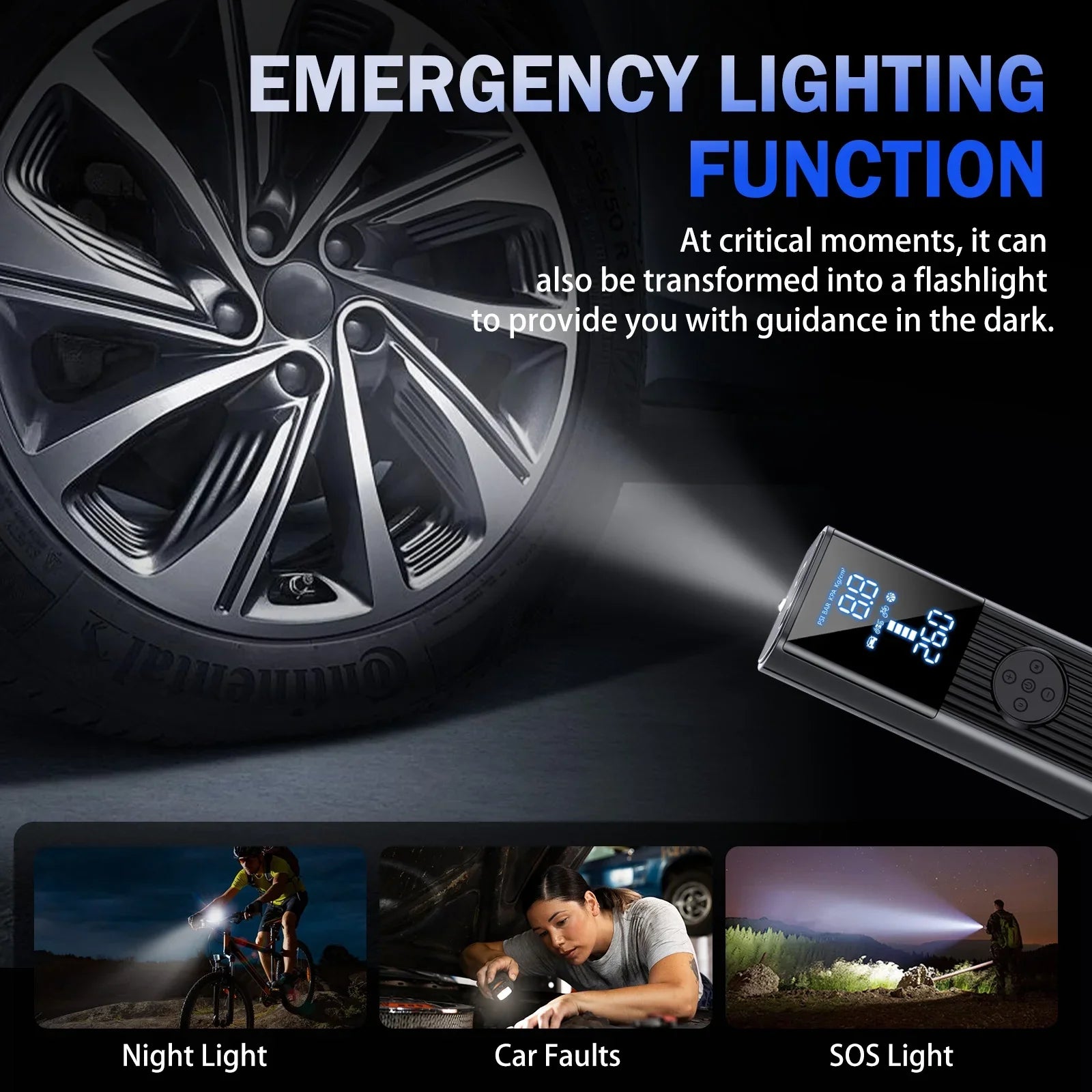 - ?¡¾LED Lighting for Nighttime Visibility¡¿The integrated LED light on the top provides illumination for nighttime inflation or tire changes, offering clear visibility in emergency situations and keeping safety in check.