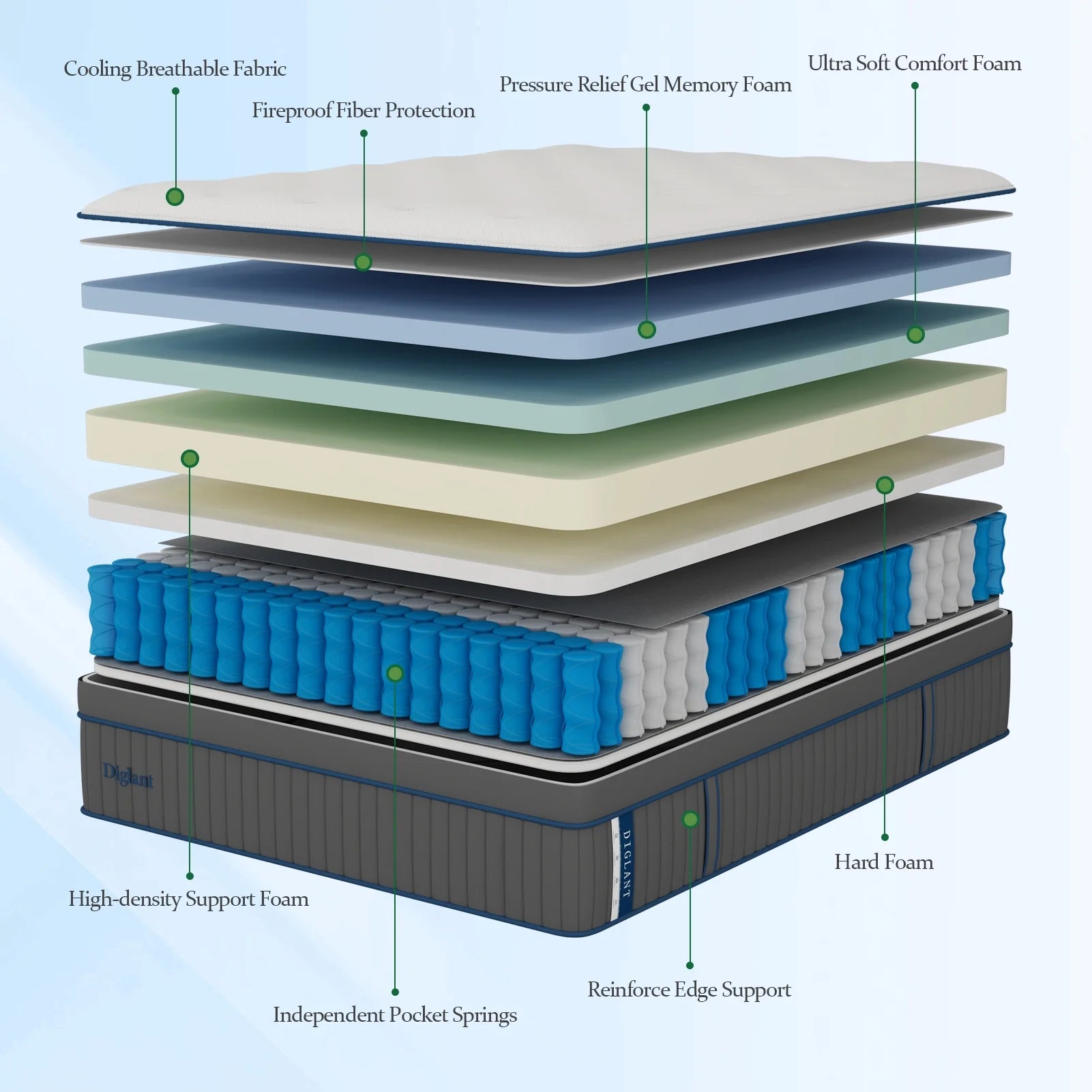 DIGLANT 14 Inch Queen Medium Plush Hybrid Mattress,Cooling Gel Memory Foam with Individually Pocket Springs, Soft Fabric Mattress Queen size for Pressure Relief, Mattress in box, CertiPUR-US