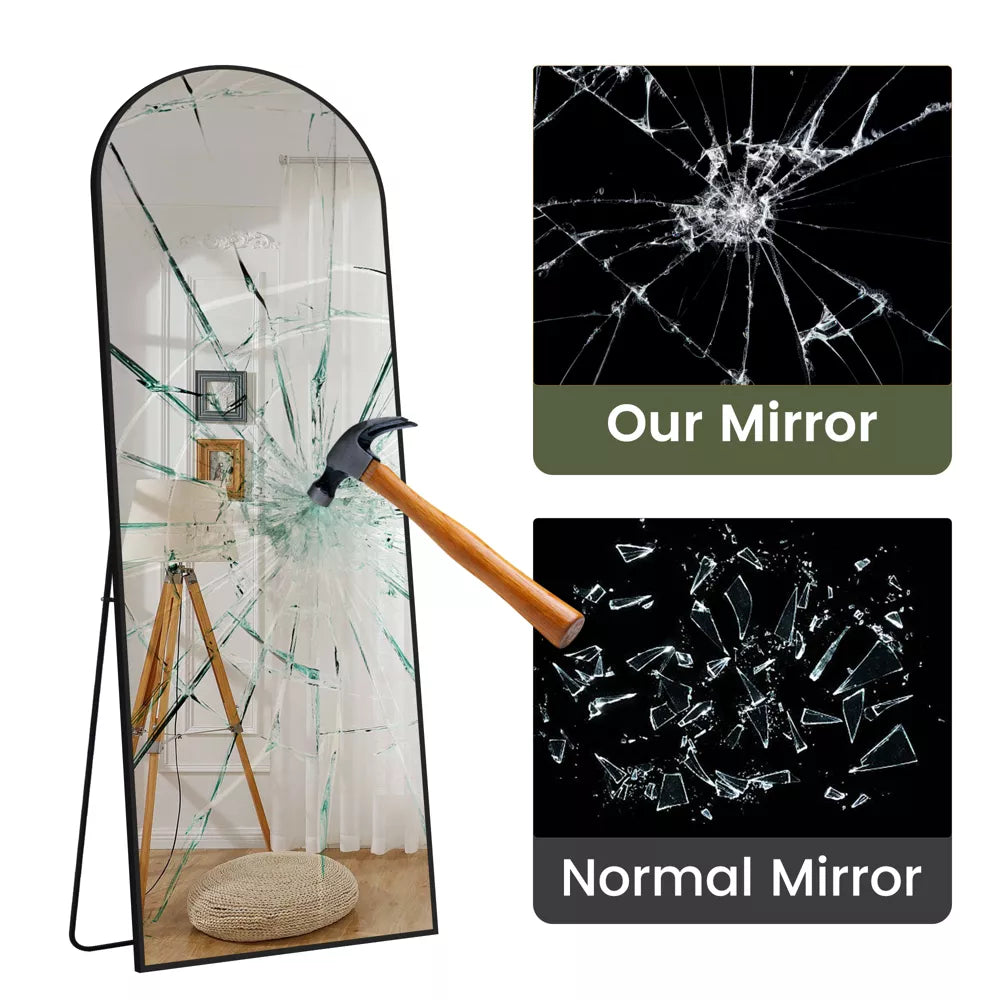 Introducing our modern arched full length mirror, featuring a durable metal frame that is rust- and corrosion-resistant. It is the perfect fusion of style and function, embodying modern elegance. Add a touch of sophistication to your space. Designed to be versatile, this mirror has hooks and brackets on the back so it can be mounted on the wall, leaned against the wall or freestanding, giving you more options to be both stylish and functional. Our full-length mirrors feature high-definition tempered glass, which not only ensures clear and detailed reflections, but its shatterproof construction puts safety first, keeping you and your family safe.