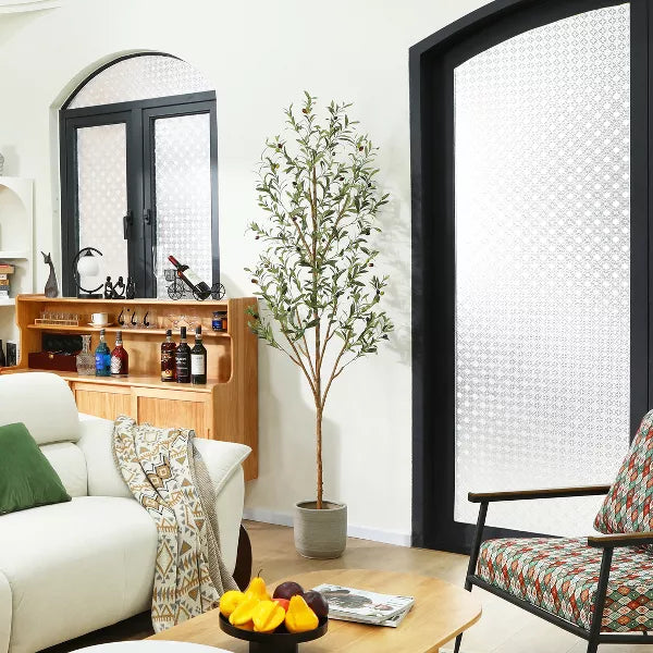 The trunk of this beautiful artificial olive tree is made of natural wood, paired with lifelike leaves and fruits, it will be an ideal decoration for your home and office, creating a tropical atmosphere for your living environment. The faux silk olive tree is super easy to maintain. all you need to do is place it in the space and dust it regularly, it will stay fresh for eternal. Our artificial olive trees come pre-assembled in heavy-duty pots made of plastic and concrete, so each tree can stand on its own. What's more, the pots are moderately sized at 6x5 inches, which makes it easy to install in other pots to bring the best decorative effect to your home and office. The olive tree branches are adjustable and you can easily rearrange them to your liking. Item may need to be reshaped when removed from the box. The 84 inch tall fake olive tree is perfectly sized for interior decoration. It is ideal for decorating living rooms, bedrooms, reading rooms, dining rooms and offices, and is also perfect for entryways, patios and commercial locations such as bookstores and coffee shops.