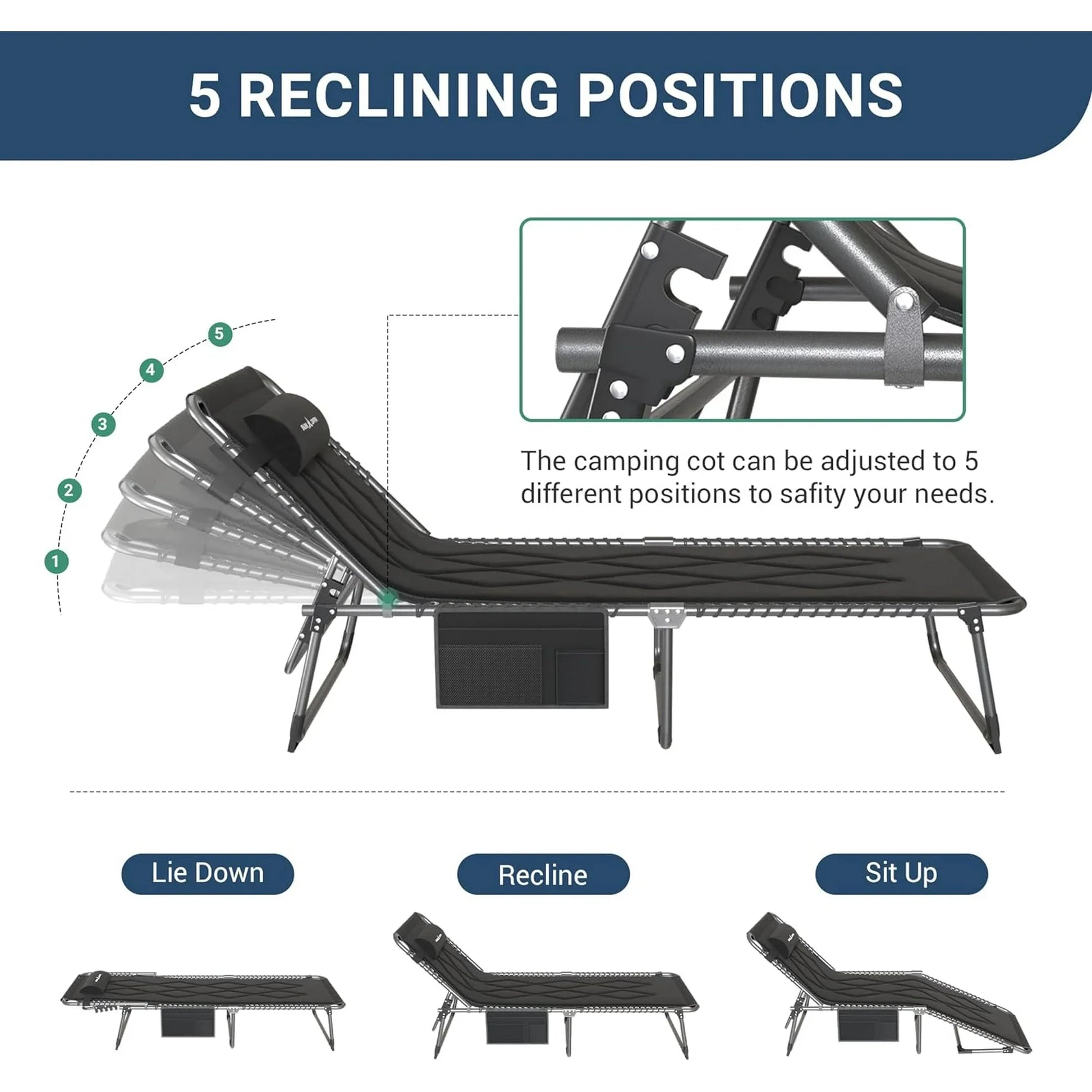 ECOPATIO Outdoor Chaise Lounges, Adjustable 5-Position Adults Reclining Sleeping Cots are designed with 5 positions adjustable locking system, which allows you to adjust it to a comfortable position according to your needs. You can sit up, recline or lay flat. When folded up, the chair measures only : 27.1" x 31, making it ideal for transport and storage. When unfolded the chair measures: When folded up, the chair measures only : 28" x 25.6" x 6.7", making it ideal for transport and storage. When unfolded the chair measures:75.2"x 25.6"x 11.8".. At 11.6 pounds of weight, very easy to be moved around. Folding Camping Bed Cots can be folded up to fit inside most car trunks. Designed for comfort: This recliner has a firm and soft surface that is perfectly balanced, and is ergonomically designed to help reduce muscle tension and stress; the beach recliner has a side pocket for your phone, books or keys; pillows Removable, can be adjusted up and down according to your needs; Multi-purpose: Tri-fold storage design, easy to transport and store. This cot will be an ideal choice for your next road trip, at home, swimming pool, lake, RV, camping, terrace, deck, tent or cabin.