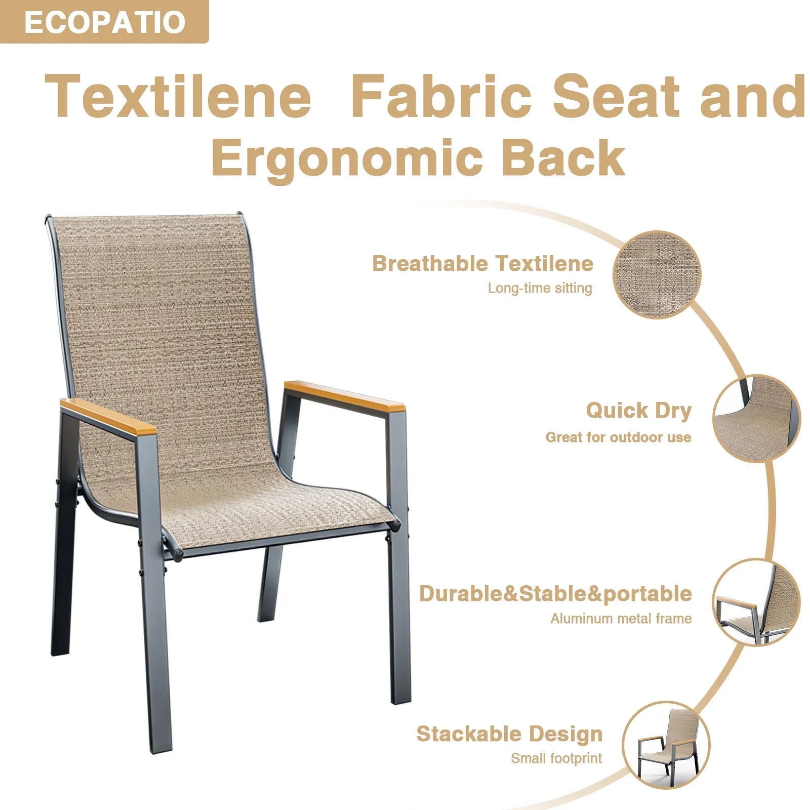 This ECOPATIO dining chair adds extra craftsmanship and style to the home, made of Textilene fabric, breathable and quick-drying, perfect for family/friend gathering, dinner,party and other outdoor events, this outdoor chair is made of high-quality steel frame and PVC-coated polyester fabric,this outdoor dining chair is lightweight, rust-proof, durable and low maintenance. Sit on the breathable Textilene seat with armrests for ultimate comfort. The chairs stack easily for storage and save space, and feature a lightweight steel frame that's easy to move and perfect for outdoor activities. To prevent scratching the floor, each foot has a non-slip rubber pad. The ECOPATIO dining chair will not let you down, take it home now!