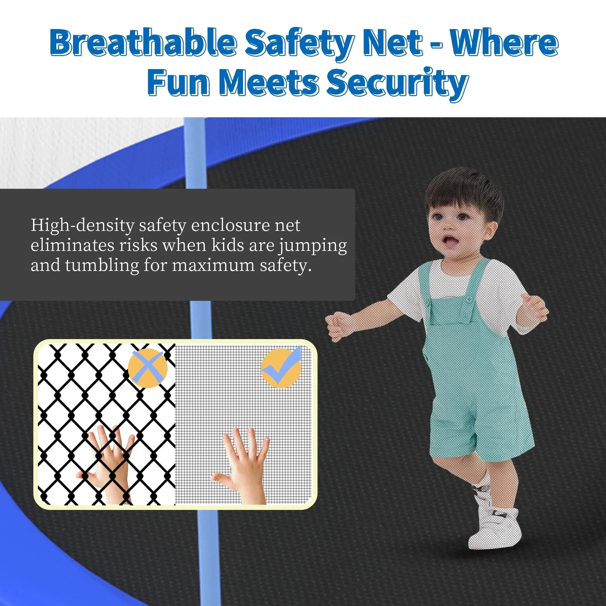 ¡¾Safety First¡¿When it comes to children, parents always pay their utmost attention to confirm the safety issues. This trampoline consists of 108 sturdy and flexible springs, combined with a high-elastic, tough jumping mat, which can ensure the stability of each bounce. We use a redundant spring configuration to ensure a soft impact and avoid excessive tension on the feet and joints, so as not to make the child feel uncomfortable.