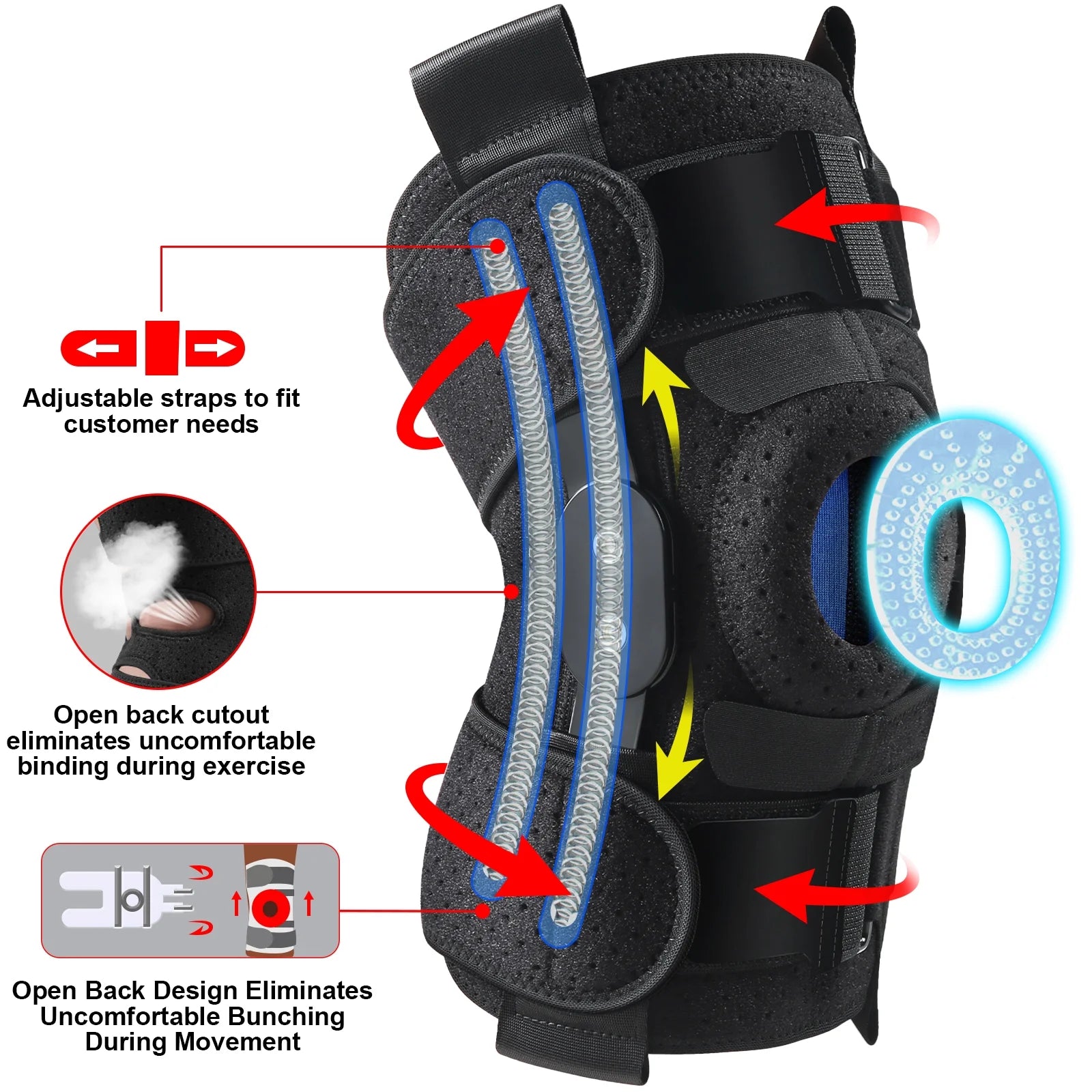 DOUBLE ANTI-SLIP, OPEN PATELLA & BACK DESIGN: Stay secure with two medical-grade silicone anti-slip strips and four adjustable straps, preventing slippage during intense activities. Advanced MCL knee brace, featuring open patella and back cushioning, reduces knee stress -All-day comfort.