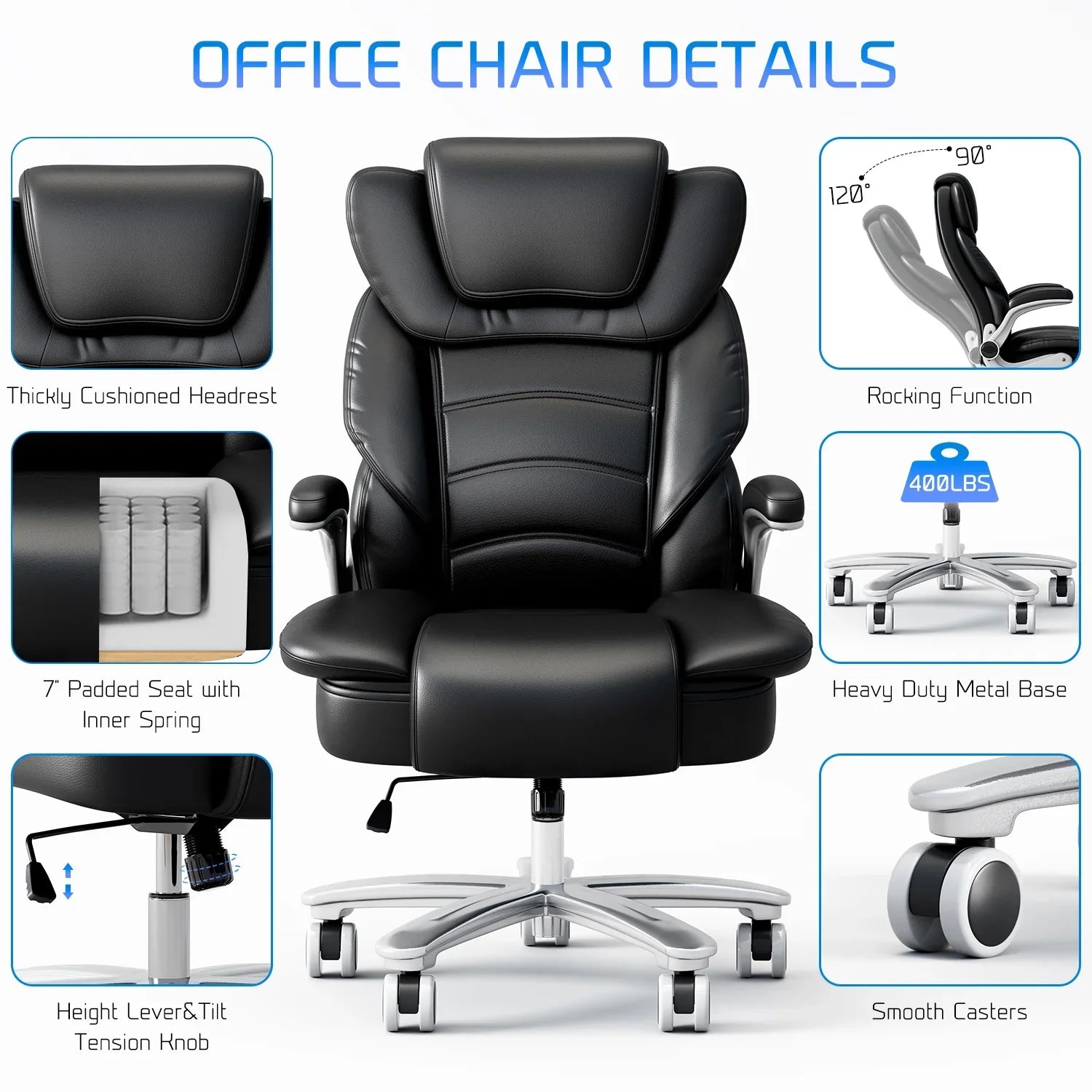 - Heavy-Duty Design:Engineered for tall and heavy individuals, our high back leather office chair boasts a robust swivel metal base, SGS Class 3-cylinder, and sturdy rubber wheels. With a weight capacity of up to 400 pounds, it provides exceptional support and stability. The extra-large seat cushion and back support cradle your body, promoting optimal posture and reducing fatigue during long work or gaming sessions.