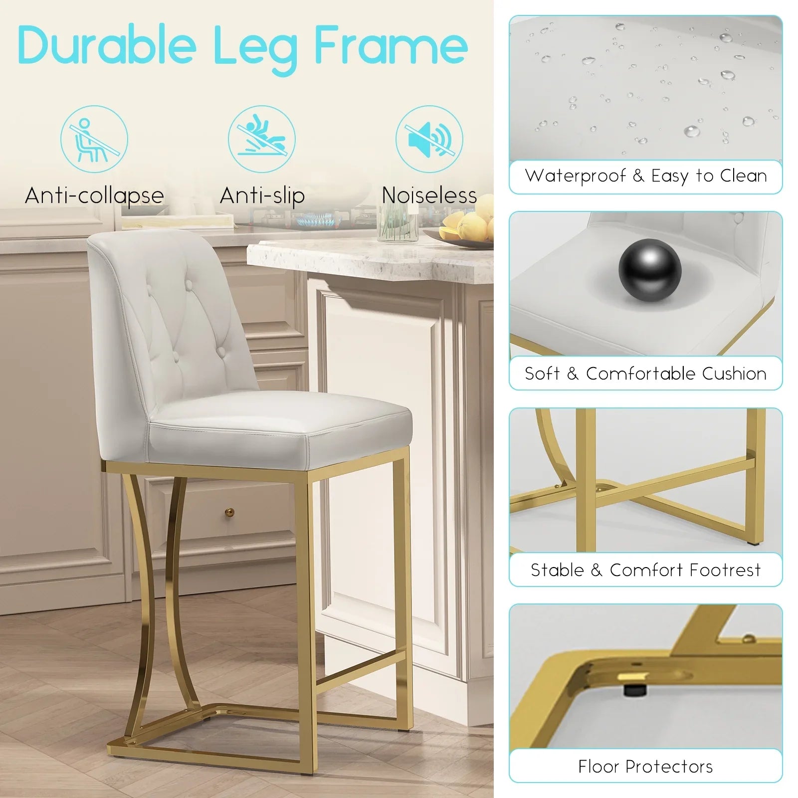 - Premium Material:the HomeZeer 24 inch counter height bar stools set of 4with white upholstery provide exceptional durability and comfort. Crafted with waterproof and scratch-resistant PU leather and soft high-density sponge, The sturdy gold metal frame with non-slip feet ensures stability and protects floors from damage.