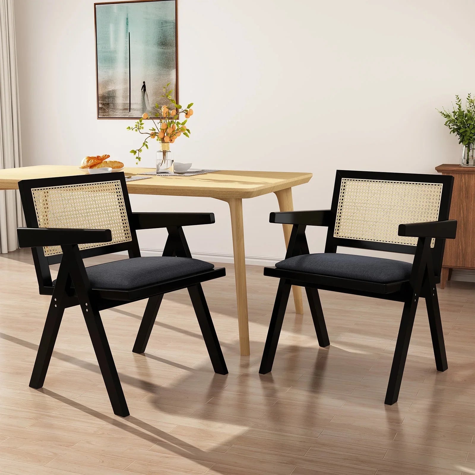HomeZeer Rattan Dining Chars Set of 2, Upholstered Kitchen Chairs with Armrest and Cane Backrest, Mid Century Wooden Frame Dining Chais, Black