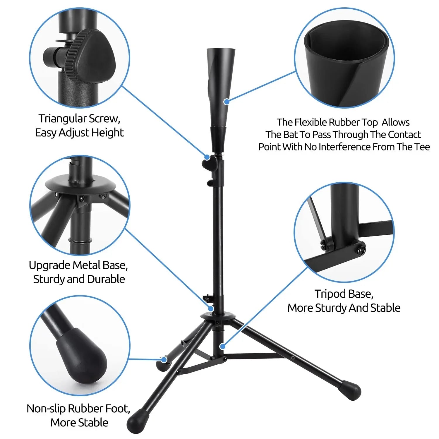 - ?¡¾Stable Tripod With Non-Slip Sleeve¡¿Portable batting tee adopts triangular structure base, can provide stable support for the top batting; The bottom leg is equipped with a rubber non-slip sleeve, which can enhance the friction of the baseball tee and is not easy to move.