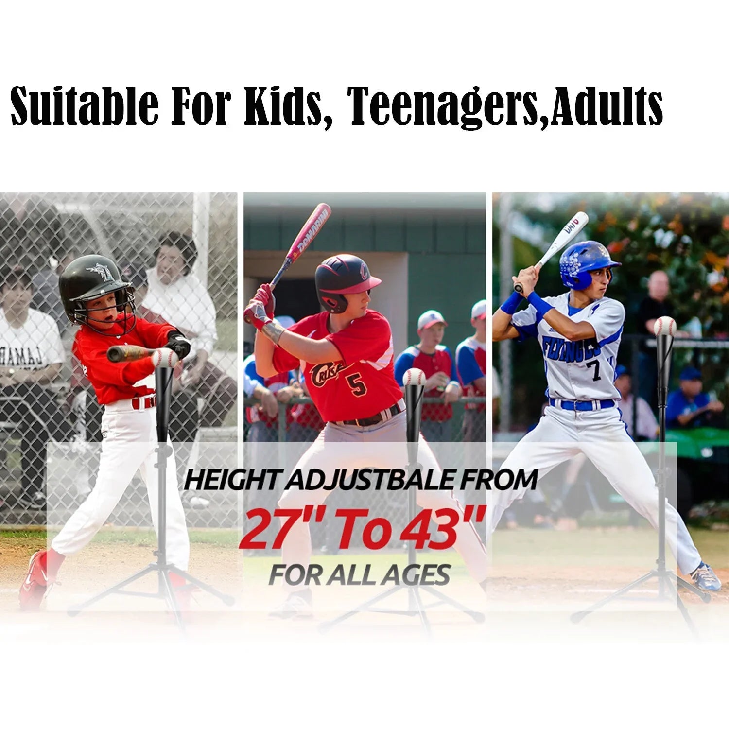 - The baseball tee is adjustable according to the height of the player, the height can be adjusted from 27 inches to 43 inches, this batting tee is suitable for kids, teenagers and adults.