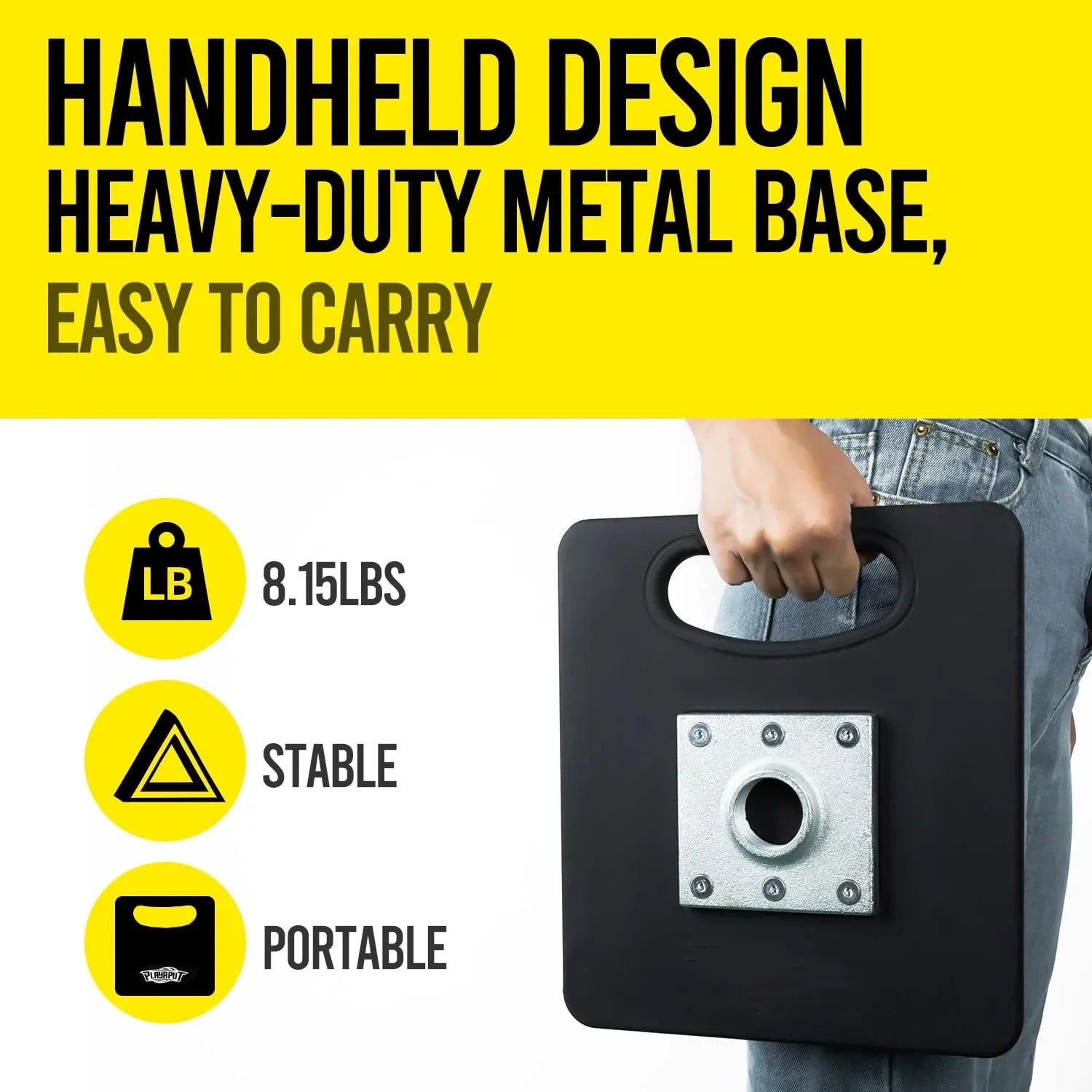Its sturdy solid metal base, weighing 8.15 lbs and measuring 10 inches wide, ensures excellent ground adhesion, stability, and prevents tipping over during swings.?