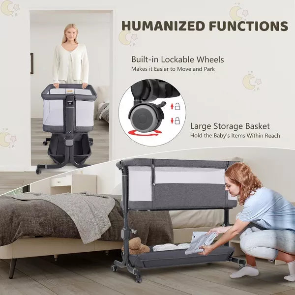 Adjustable Height &Angle : With 6 adjustable heights, this baby bassinet can adapt to different heights of beds and sofas; Even in the midnight, the beside bed sleeper can provide comprehensive care and protection for babies