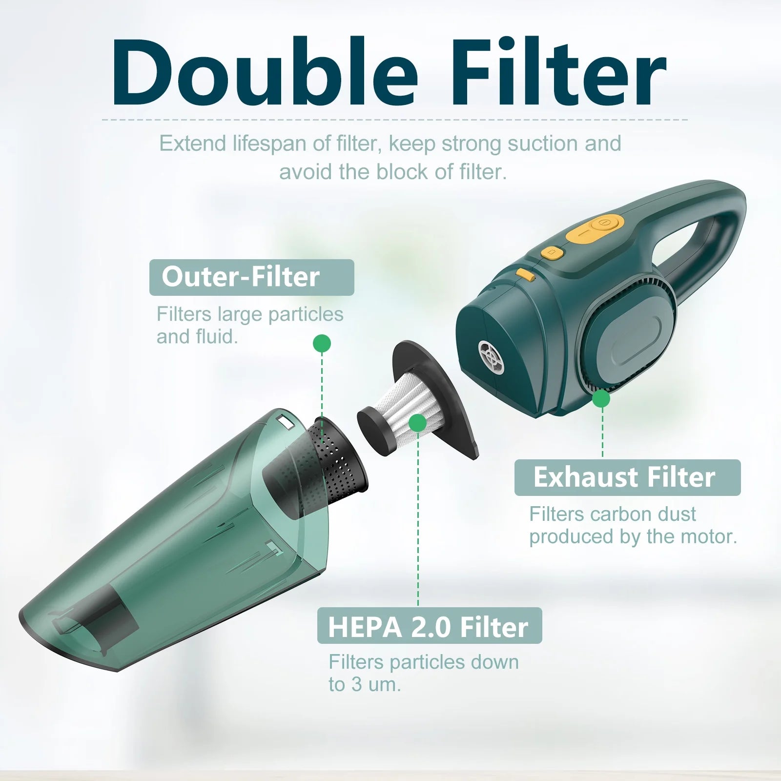 Washable Double-Layer Filter System: The cordless hand vacuum come with an upgraded double-layer filter system that effectively filters out fine particles. It has a filtration efficiency of 99.5%, which helps prolong the service life and avoids clog filters for the best cleaning performance. You can easily remove and rinse both the filter and filter mesh under running water.