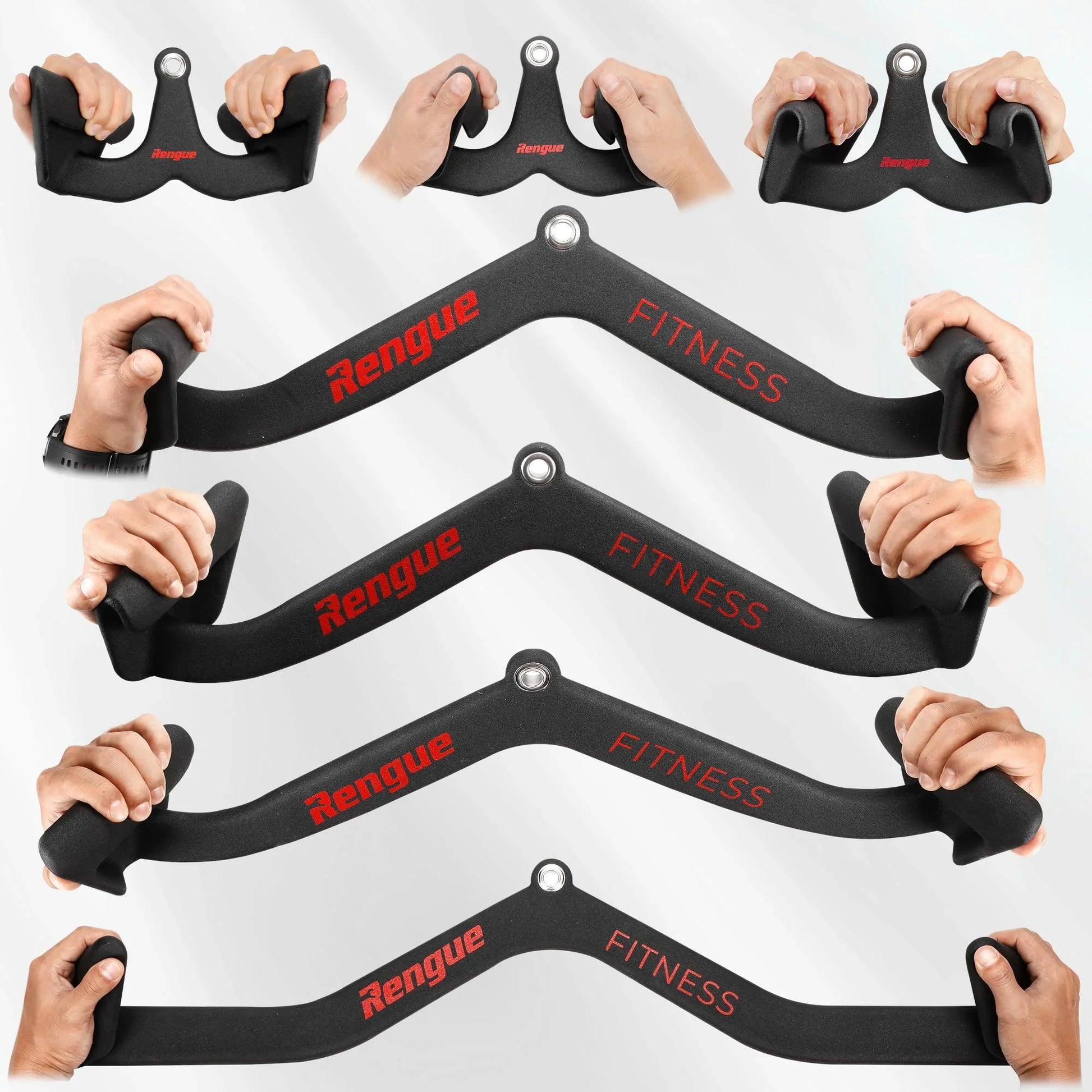 - ??【HIGH PULL-DOWN ATTACHMENT SET】 Our lat pulldown machines set has 7 models, No. 1, 2, and 3 are narrow range handles, mainly training the trapezius and rhomboids. No. 4, 5, and 6 are medium-range handles, and No. 7 is a wide-range handle that mainly exercises the teres major, teres minor, and latissimus dorsi muscles. Meets your needs at home or in the gym and easily connects to any cable machine.