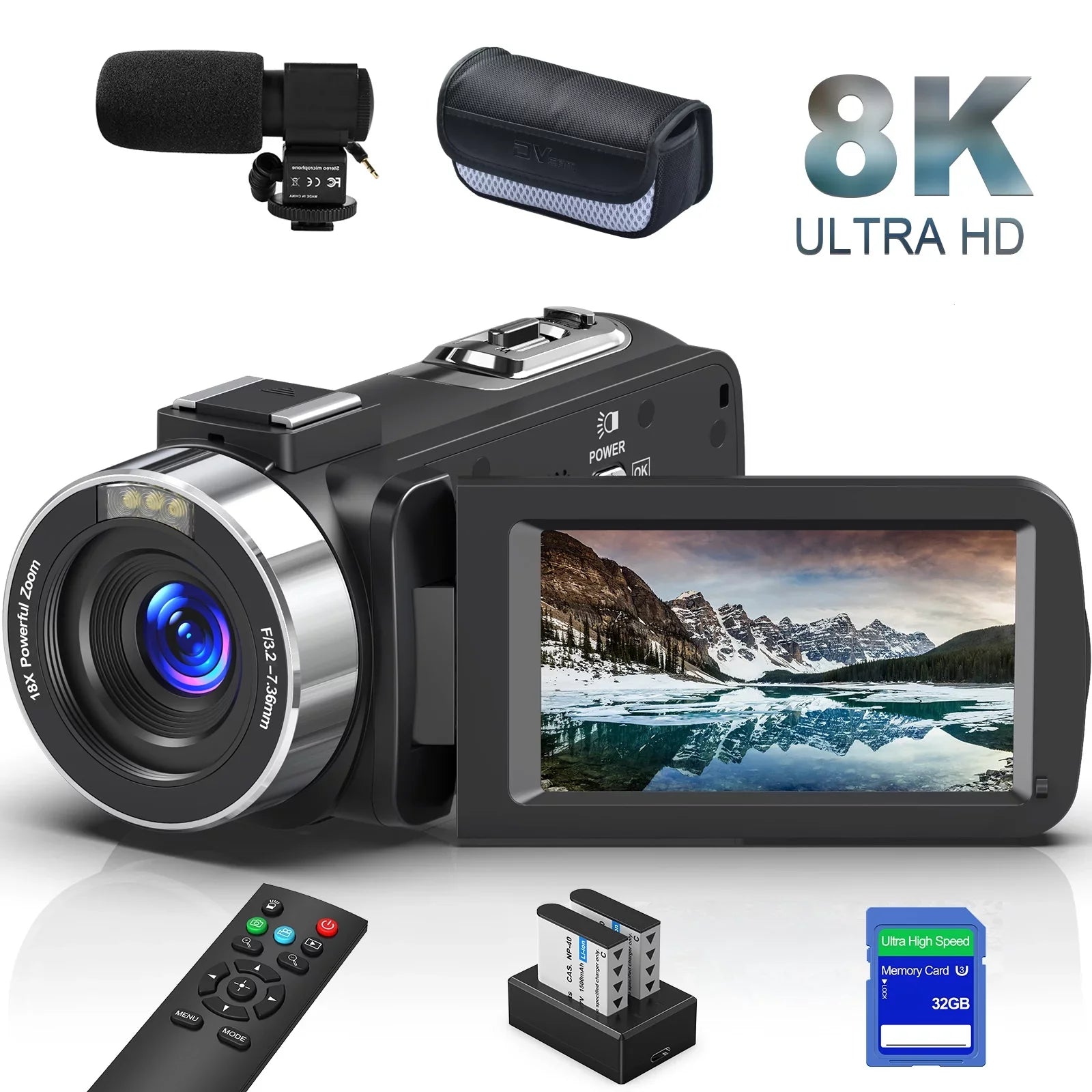 8K 64MP Video Camera Camcorder: This camcorder provides excellent video quality and offers a range of resolution options including HD 8K (7168x4032p)/15FPS, 6K(5760x3240p)/30FPS, and 4K(3840X2160p)/60FPS. It features a 3.0-inch IPS touchscreen, 64MP image resolution, and 18X digital zoom, allowing you to effortlessly capture stunning landscape shots or distant subjects. Additionally, it is compatible with SD memory cards (32-256G, Class 10 or above) and standard tripods, and supports external LED lights (not included), making it an ideal choice for video enthusiasts.