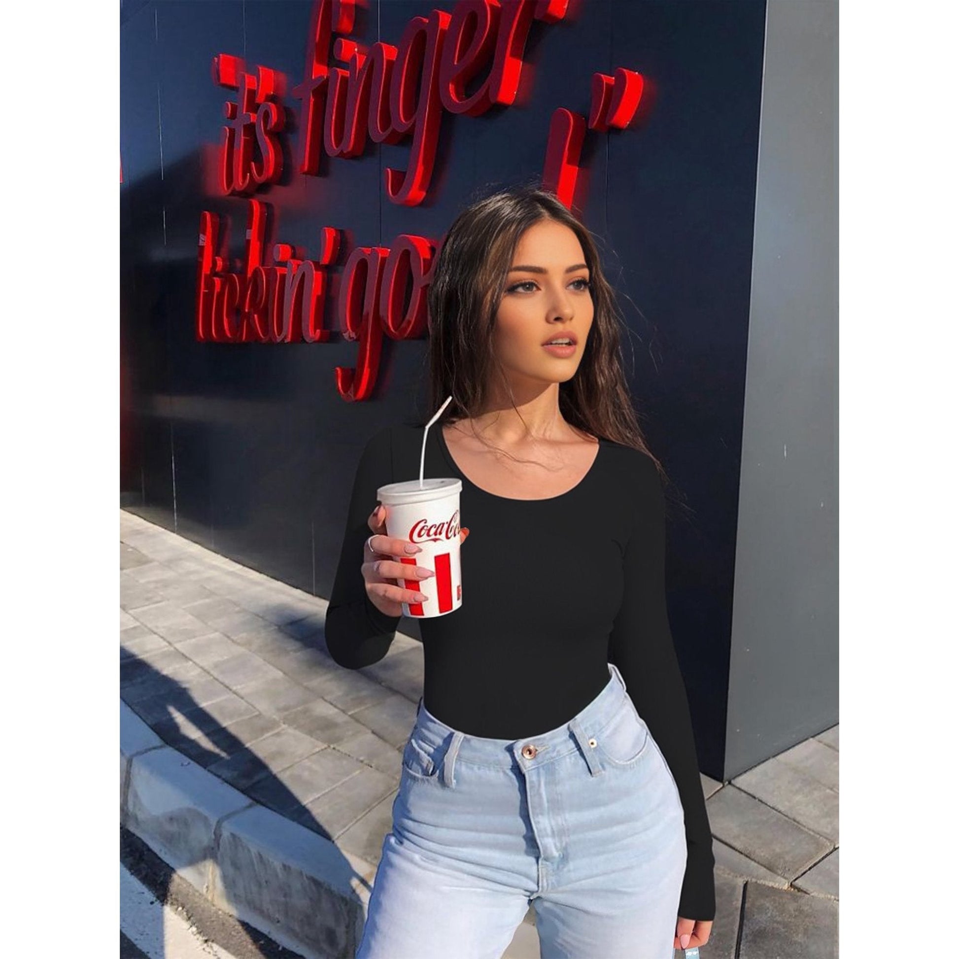 LinenMarket Round Neck Long Sleeve Bodysuit Fitted Womens Tops