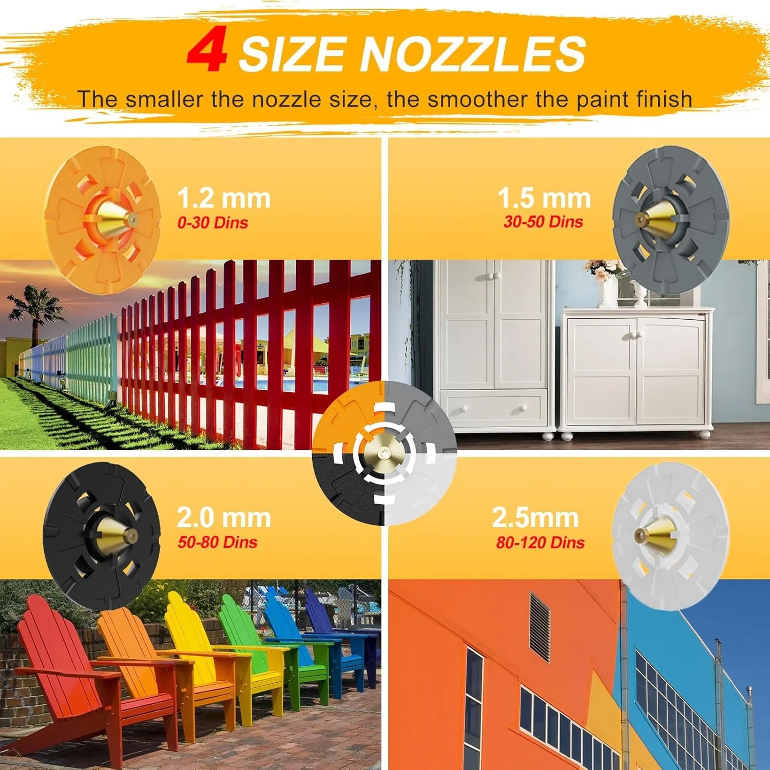 - 4 Nozzles & 3 Spray Patterns - 700W paint sprayer equipped with 4 size nozzles (1.2mm, 1.5mm, 2mm, 2.5mm) for most painting projects, such as furniture, pickup, walls, doors, garden tables, and cabinets, etc. Smaller nozzles are suitable for fine spraying, while larger nozzles are suitable for large-area spraying. It can be adjusted to 3 different spray patterns: horizontal, vertical, and circular, making it suitable for a wide range of application scenarios. Max Viscosity: 120 Din-s