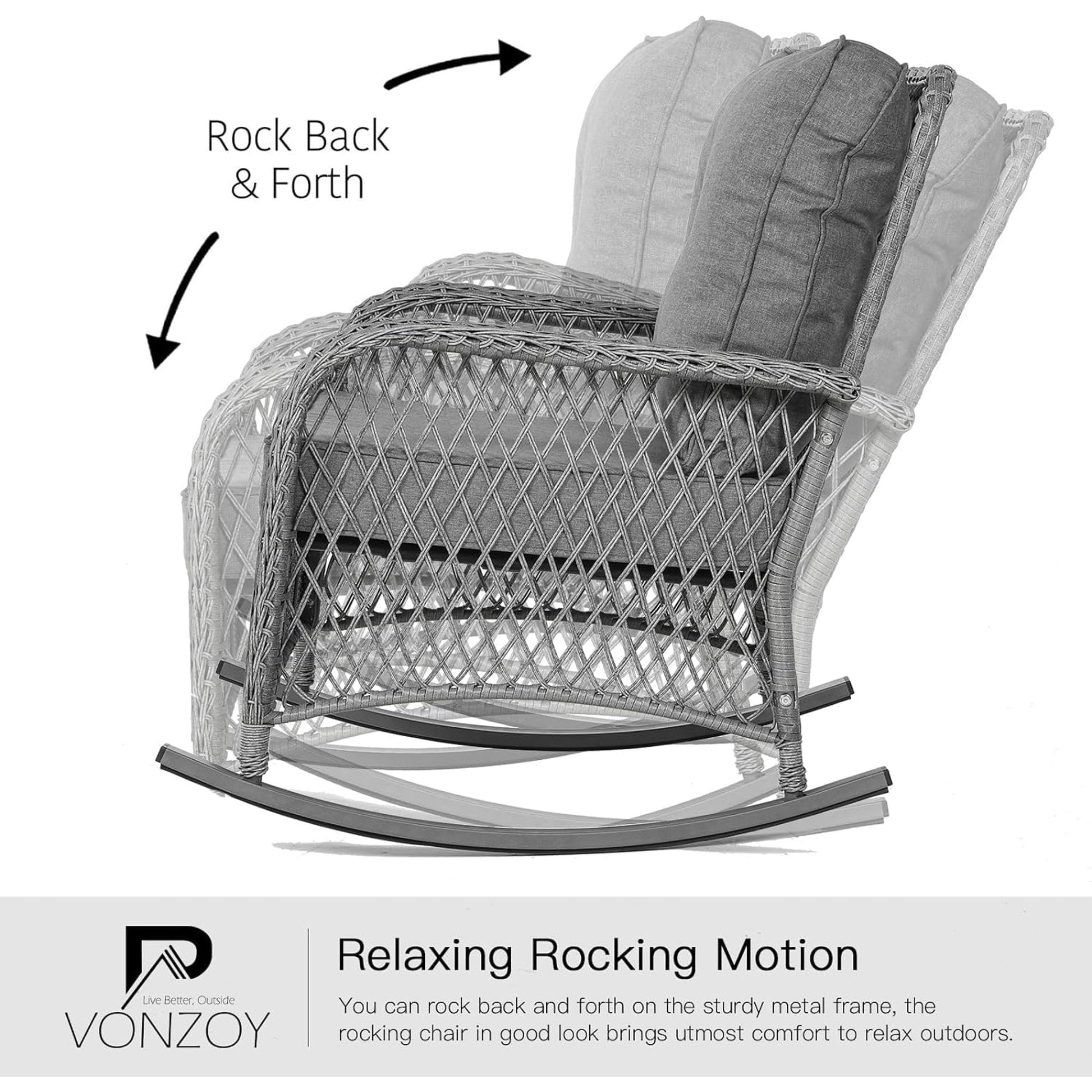 - ¡¾The Serene Comfort of Gentle Rocking¡¿ The sturdy metal frame is seamlessly integrated with elegant curved bands, offering a gentle 15-degree rocking motion. The thoughtfully designed anti-slip and silent strips underneath the rocking chair ensure a silky-smooth rocking experience, free from noise. Its exquisite design is not only visually pleasing but also provides unparalleled comfort and relaxation for outdoor leisure time.