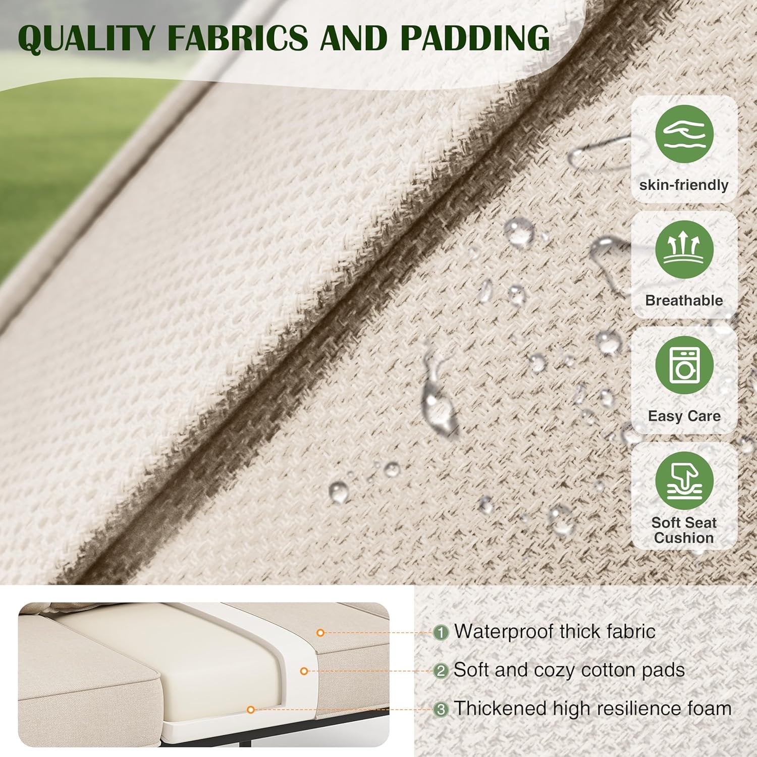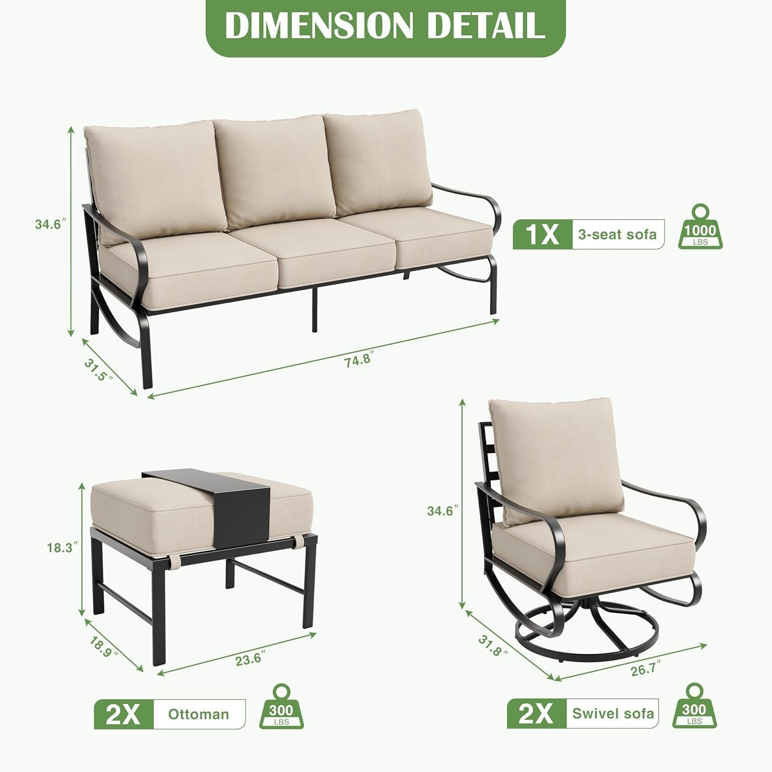 - ¡¾5.75'' Thick Cushions & Soft Back Pillows¡¿ Enjoy unparalleled comfort with 5.75-inch thick cushions and plush, soft back pillows, designed to provide lasting support. The patio furniture sets cushions are covered in water-repellent fabric that is easy to clean and maintain, while also being highly breathable. Perfectly paired with the robust metal frame, this outdoor patio set ensures that your seating remains comfortable and durable, perfect for any outside furniture setting.
