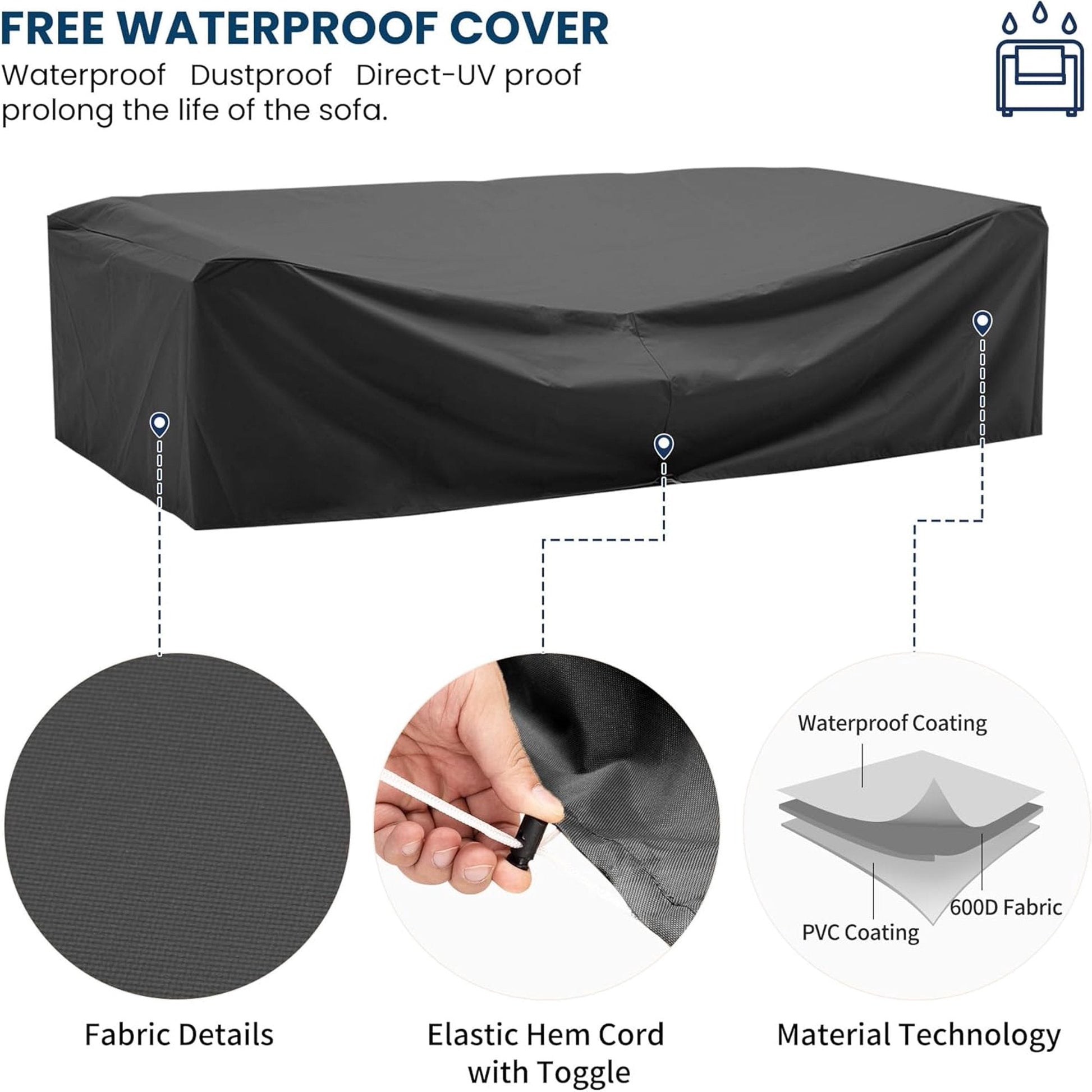 - ¡¾WATERPROOF COVER INCLUDED¡¿No extra cover-fees of our wicker outdoor sectional furniture. We provide 100% waterproof wrap sofa cover. The cover adopts waterproof and water repellent coating in the outermost layer. The middle mezzanine layer uses 600 density fabric. The inner layer is covered with waterproof PVC coating.The cover also has adjustable hem cords.Triple craftsmanship makes the sectional not easy to suffer stains and terrible weather. Will be more durable and long-lasting.