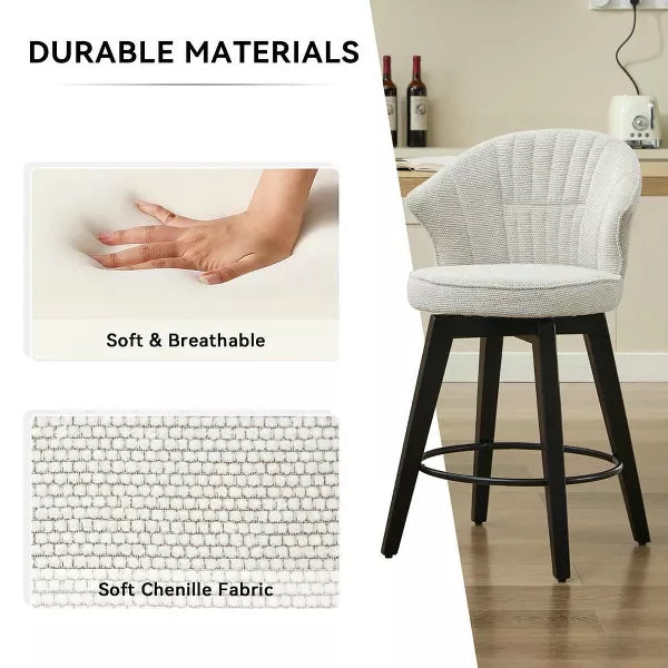 Elevate your dining experience with this Set of 2 Counter Height Swivel Bar Stools, designed to seamlessly blend modern comfort with versatile functionality. Featuring plush chenille upholstery and a wide, ergonomic backrest, these swivel bar chairs provide exceptional lumbar support for long-lasting comfort at your kitchen island, home bar, or dining room. The 360-degree smooth-rotation base allows effortless movement, while the adjustable 24"-26" seat height ensures perfect alignment with countertops or high tables. Crafted with a durable metal frame and scratch-resistant legs, these white bar stools combine stain-resistant fabric with easy-clean surfaces, making them ideal for busy households or entertaining guests. Their space-saving design and neutral white finish effortlessly complement farmhouse, contemporary, or transitional decor styles. Perfect as kitchen island seating, breakfast nook chairs, or casual dining room accents, this pair of swivel stools includes all necessary hardware for quick assembly. Invest in premium comfort and timeless style �C the ultimate upgrade for your home bar, apartment, or open-concept living space. Kepooman Counter Bar Stools, Counter Stool,Set of 2 Counter Height Swivel Bar Stools with Wide Backrest, White