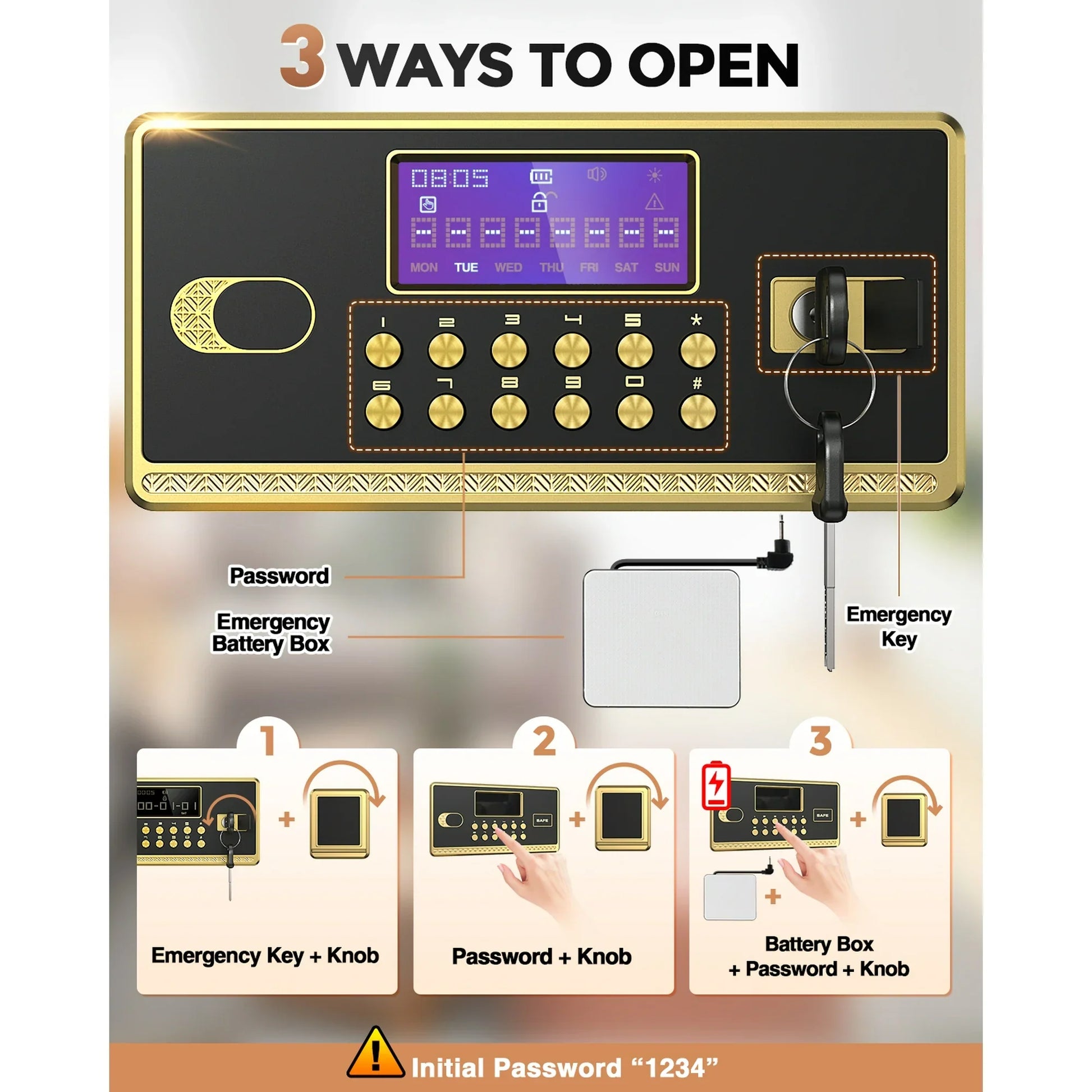??Programmable Keypad and Emergency Key: The safe has three ways to unlock. ①: Personal Password + Knob; ②: Emergency Key + Knob; ③ External Battery Box + Personal Password + Knob (When your battery runs out, the additional external battery box allows you to replace the battery at any time). The security safe is also equipped with a high-definition LCD, which can display the password, time, date, and power. (Note: Please do not put the spare battery box and key inside the safe.)