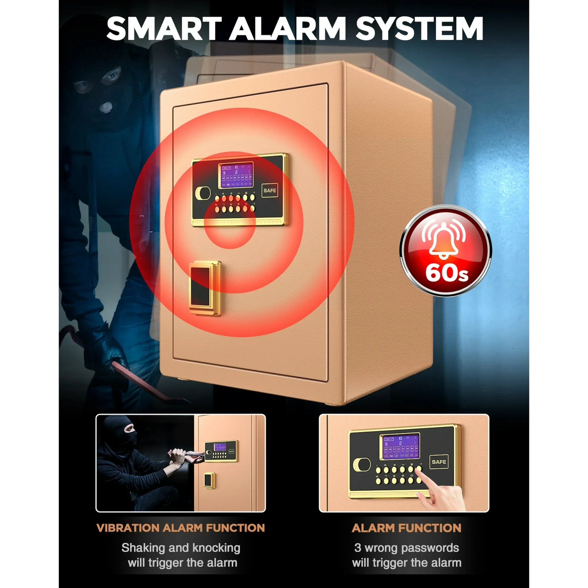 ??Double Alarm System: RXDSAFE safe box is equipped with a dual alarm system to prevent password guessing and effectively prevent unauthorized access. Entering the wrong password 3 times in a row or a thief moving/severely hitting/vibrating the safe will activate the alarm system for 60 seconds, which means that when your safe is "in danger", the alarm function will buy you time. After entering the correct password or using the key to open the safe and press the reset button, the anti-theft buzzer will end.