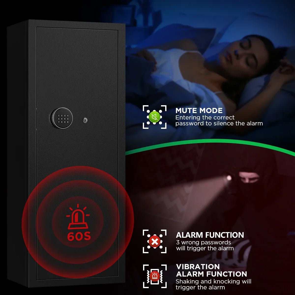 【Smart Alarm Mode】The rifle gun safe is equipped with a dual alarm system. After entering the wrong password three times, the gun safe's alarm mode will be activated and the buzzer will sound for 60 seconds. The alarm will also sound when the gun safe is shaken/vibrated. During the alarm, you can enter the correct password or open the door to remove the battery to disarm the alarm. The alarm system allows you to safely store your guns in the gun safe to prevent theft.