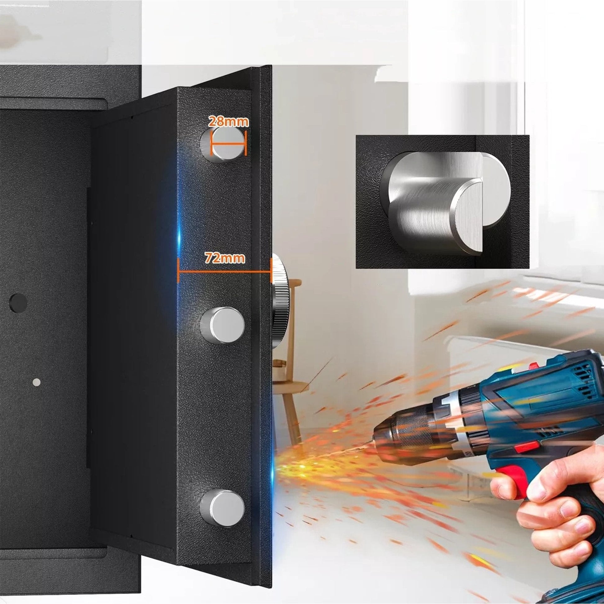 ??Heavy-duty Anti-theft Design: RXDSAFE safe is made of new upgraded reinforced solid steel material, equipped with a 64mm thick alloy anti-pry steel door and three 25mm thick high-strength solid lock bolts and anti-pry hidden hinges, which are very sturdy and durable, providing reliable protection for your valuables. Our fireproof safe has pre-drilled mounting holes on the back and bottom for wall and floor bolt fixing, which can effectively block thieves from smashing, drilling, and prying, prevent thieves and angry teenagers from taking your belongings, and protect your privacy.