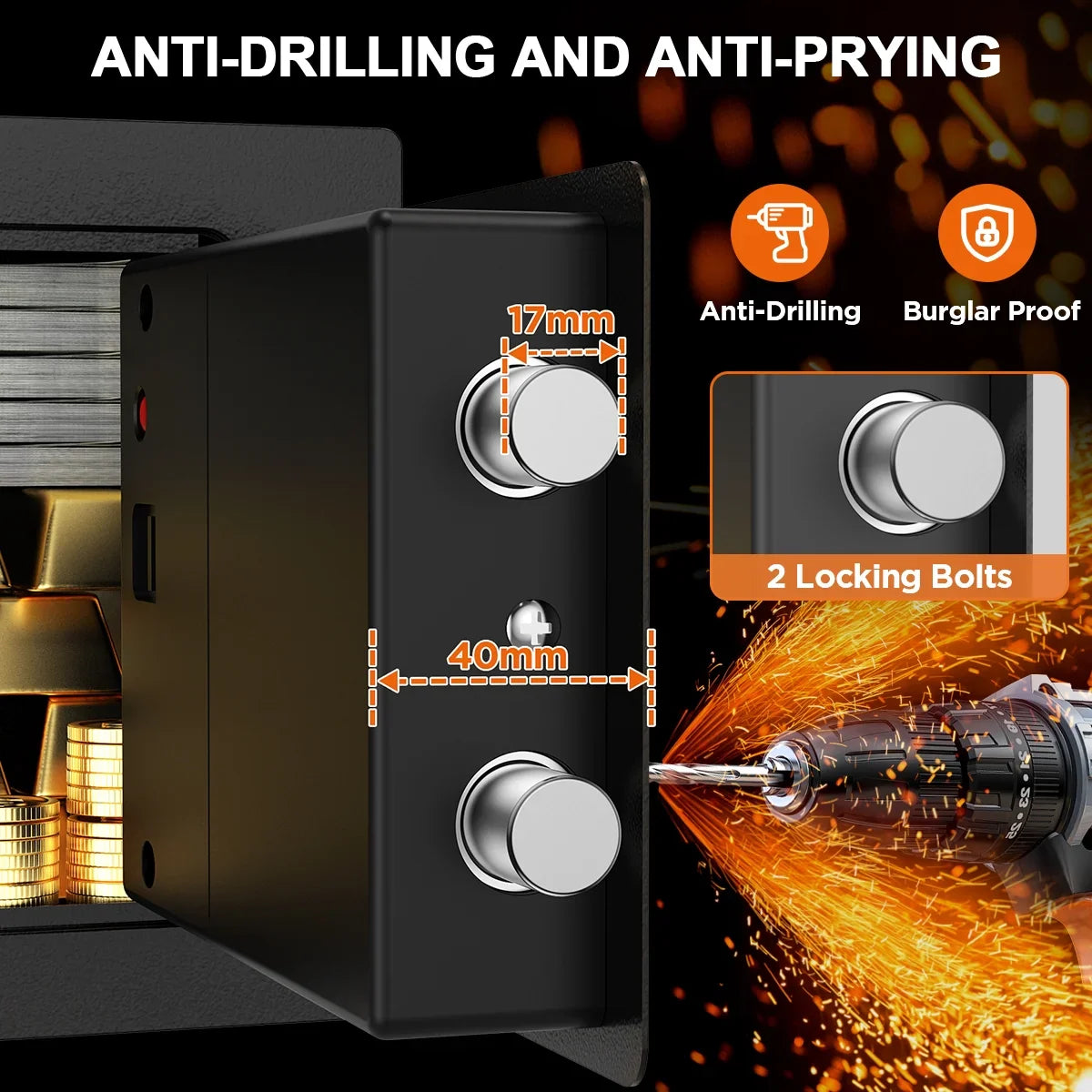 ✅【Easy Installation】This home safe box has a wall-mountable design, including 2 expansion bolts and 2 pre-drilled installation holes. Using just two bolts, you can hide it in a closet, embedded in the wall, and on a shelf. This means that thieves can't take it away easily.