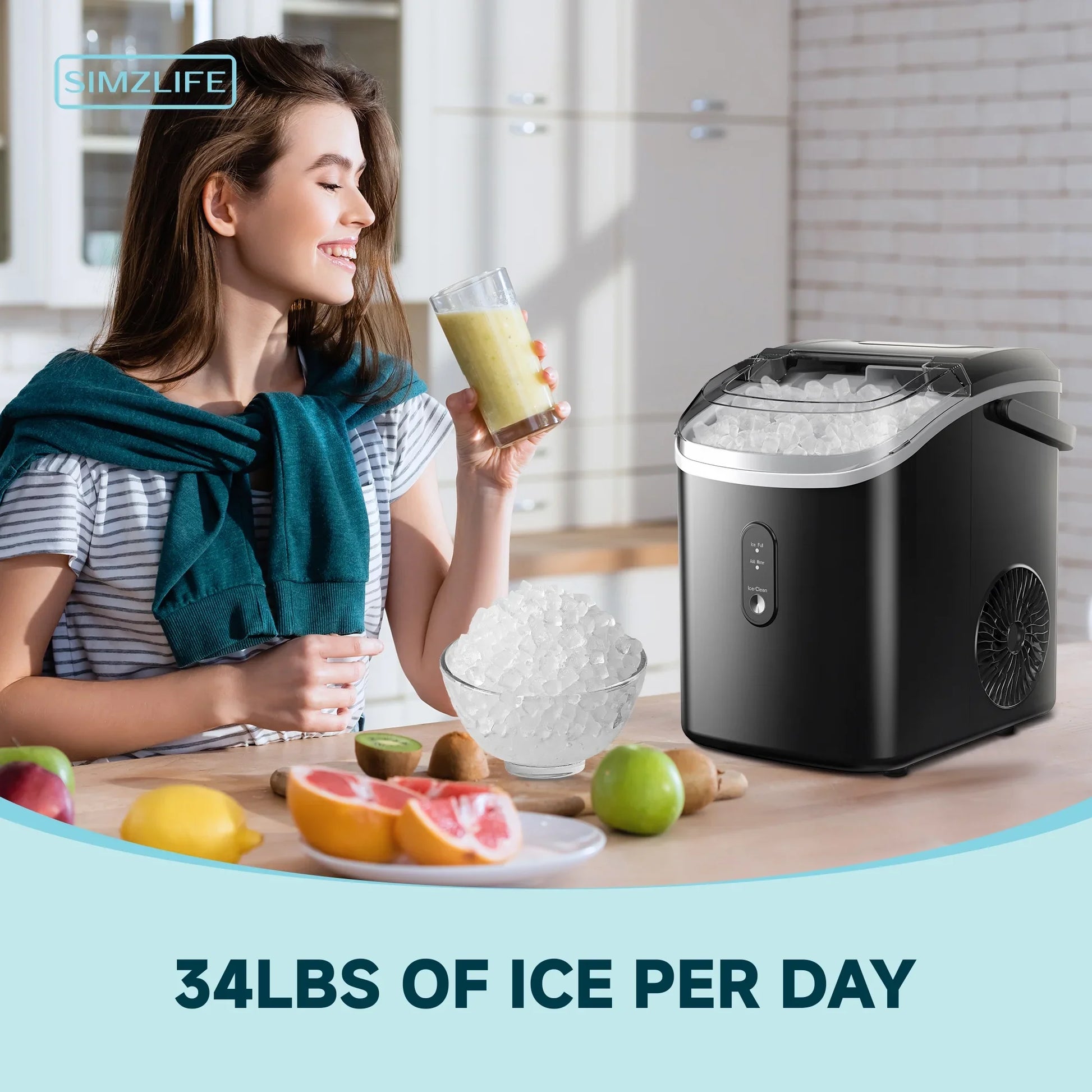Simzlife Nugget Ice Maker Countertop, Portable Ice Maker Machine with Handle, Self-Cleaning, Ready in 6 Mins, 34lbs/24H, Soft Chewable Ice, Black