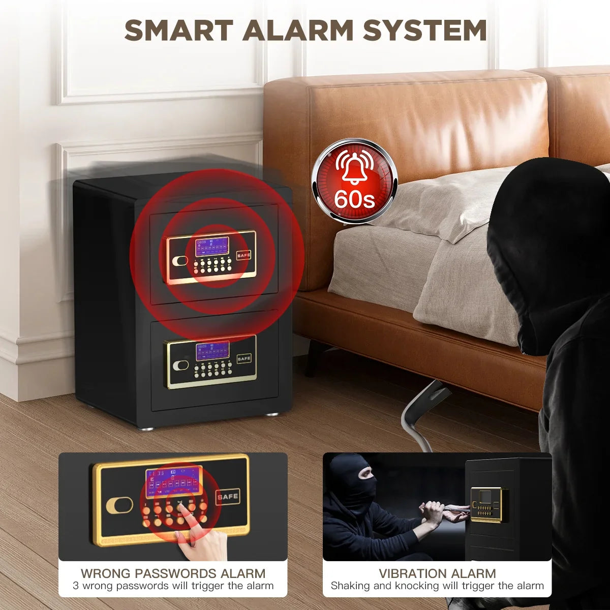 Large Double Door Safe Box For Home Use: TNTANTS home safe capacity of 4.6 Cu ft in total. The external dimensions are 14.96"D x 12.6" W x 19.88" H. It features an upgraded dual-door design for separate access, providing a spacious interior space for the safe, you can store items of different sizes. Our Lockbox is very suitable for valuables such as jewelry, medicine, cash, pistols, etc. It also comes with a fireproof waterproof safe bag for important documents, and the security safe box can protect your valuables from theft, or children and nosey visitors prying.