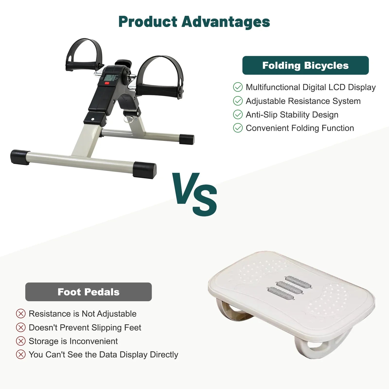 - ¡¾Multifunctional Digital LCD Display¡¿This folding pedal bike is equipped with a multifunctional digital LCD display that provides comprehensive data support for your workouts. Time, count, RPM, and calories burned can be displayed alternately through the scan function, eliminating the need for manual switching and making your exercise more convenient.