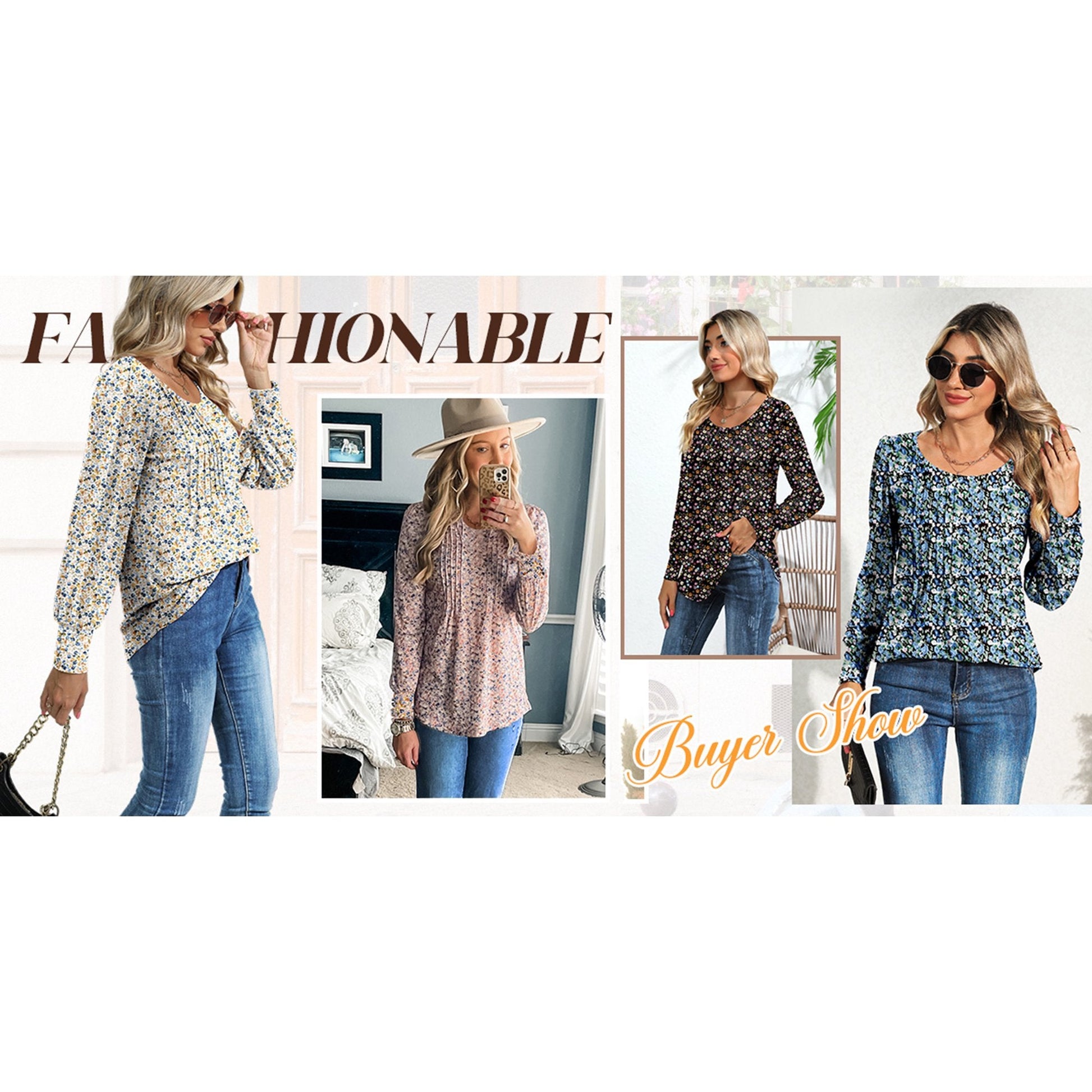 LinenMarket Floral Blouses for Women Pleated Long Sleeve Shirts Casual Crewneck Tunic Tops