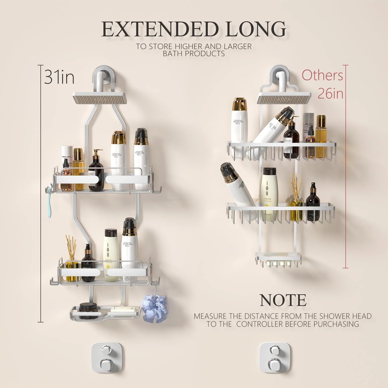 - Extra Long Hanger - Hook on top with an extended length, this over head shower caddy easily accommodates tall shampoo bottles and hangs low, suitable for both high and large rain shower heads inside shower