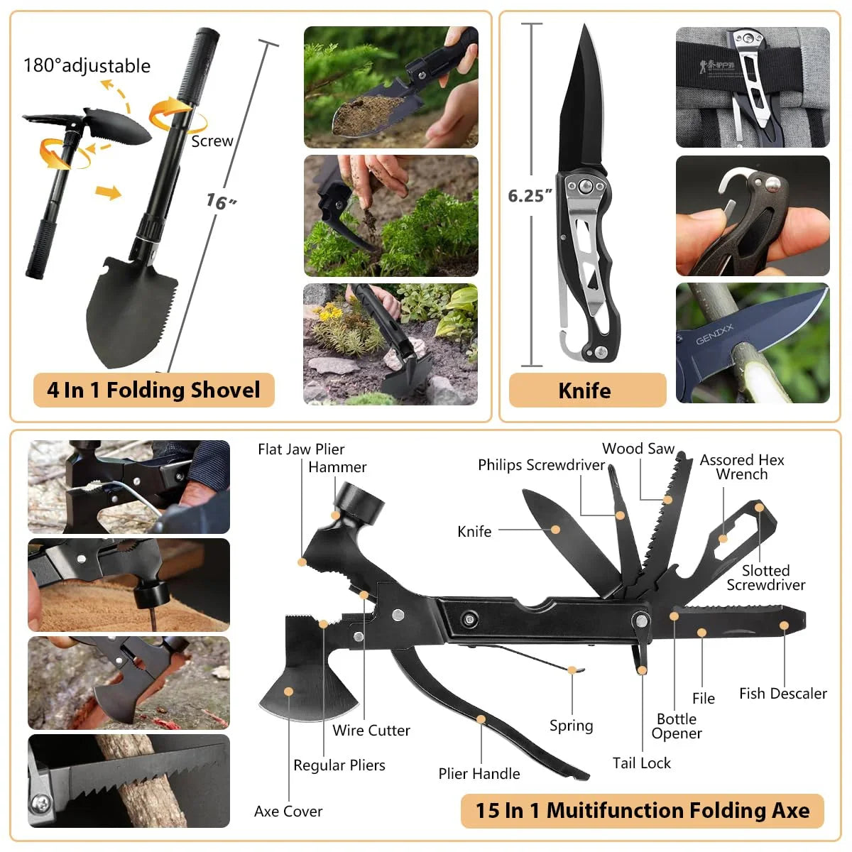 - [Upgraded Version]: Nobody can count on friendly weather during an emergency. This kit can help you to deal with the worst. It is the most multifultional survival kit in the market, contains multifultional axe, folding shovel, parachute cord, knife, emergency tent and blanket, whistle, compass, and fire starter, lantern, raincoat. It could assist you in creating a makeshift shelter, provide additional security and warmth, retain body heat.